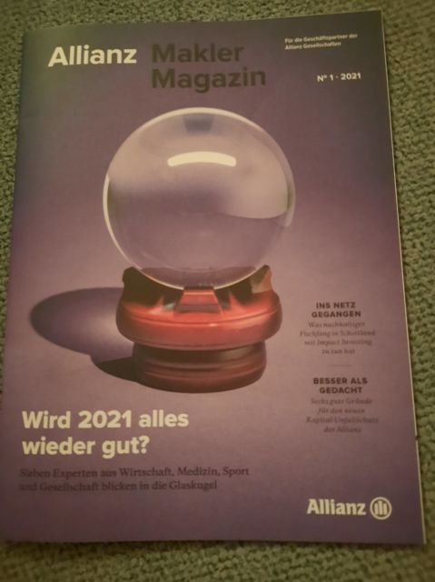 Man kennt das schon. Jedes Jahr im Januar sind die Zeitschriften, Zeitungen und Anzeigenblätter voll mit Jahreshoroskopen. Dass jedoch der größte Versicherungskonzern Deutschlands, die Allianz, der sich normalerweise nur auf wissenschaftliche Statistiken und auf die Versicherungsmathematik verlässt, in seiner Fachzeitschrift „Makler Magazin“ (Ausgabe 1/2021) einen Hellseher bemüht, um in die Zukunft blicken zu können, erstaunt dann doch.
