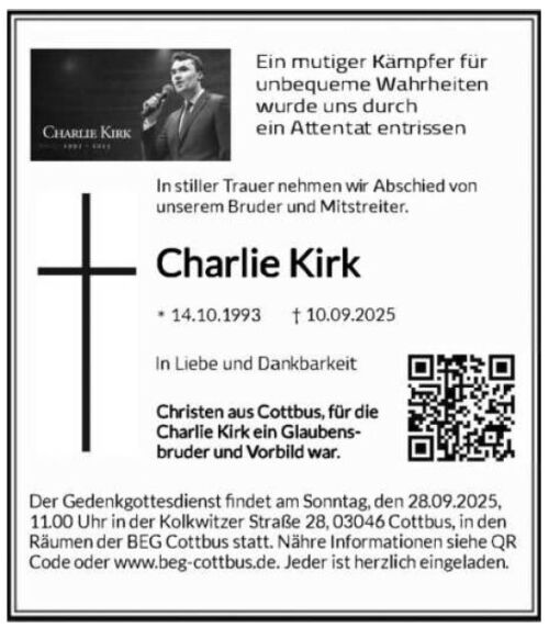 Die Bekennende Evangelische Gemeinde (BEG) Cottbus lädt in Erinnerung an den während einer Diskussionsveranstaltung auf dem Campus der Utah Valley University in Orem (USA) am 10. September 2025 ermordeten Christen Charlie Kirk für den 28. September um 11:00 Uhr in die Kolkwitzer Straße 28 zu einem Gedenkgottesdienst ein.