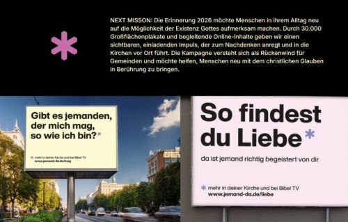 „Die Aktion ist vollständig spendenfinanziert von über 6.000 Christinnen und Christen aus unterschiedlichen Konfessionen, die Gott in dieser Welt sichtbar machen und Menschen in die Gemeinden einladen wollen. Organisiert wird die Kampagne von der überkonfessionellen und gemeinnützigen Bibel TV Stiftung gGmbH, deren Gesellschafter unter anderem die Rentrop-Stiftung, die katholische und die evangelische Kirche, die Vereinigung der Freikirchen und viele weiteren christlichen Werke sind.“